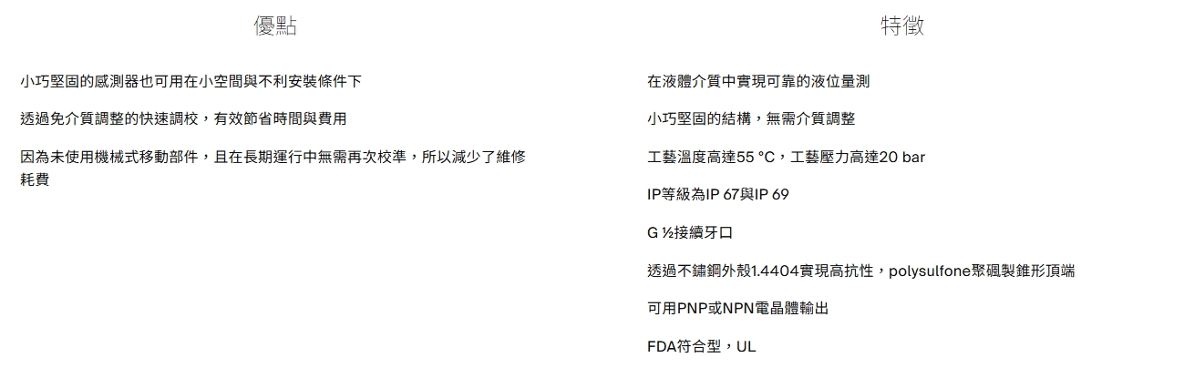GRF18S是精巧型光學液位開關,尤以調試簡易出眾。此感測器是以SICK能量型直接反射式光電感測器的可靠技術為基礎。因此實現簡單、堅固且可靠的感測器。GRF18S使用優質材料(例如不鏽鋼1.4404與聚碸)以及IP等級為IP69的外殼,即使在容器罐外側等不利環境條件下仍可確保高工藝安全性。調試快速又順暢(無需調整介質),這不僅降低調試費用還減少維護成本。基於光學技術,GRF18S特別適用於水基介質。